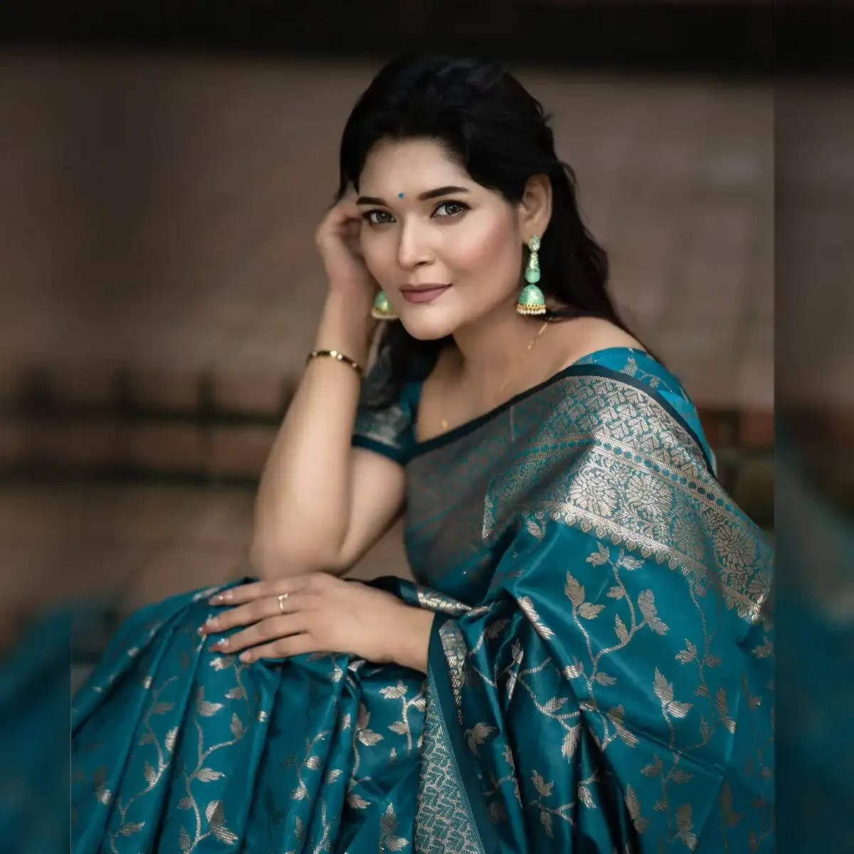 নীলচে সবুজ কাতান সিল্ক শাড়ি - ব্লাউ...