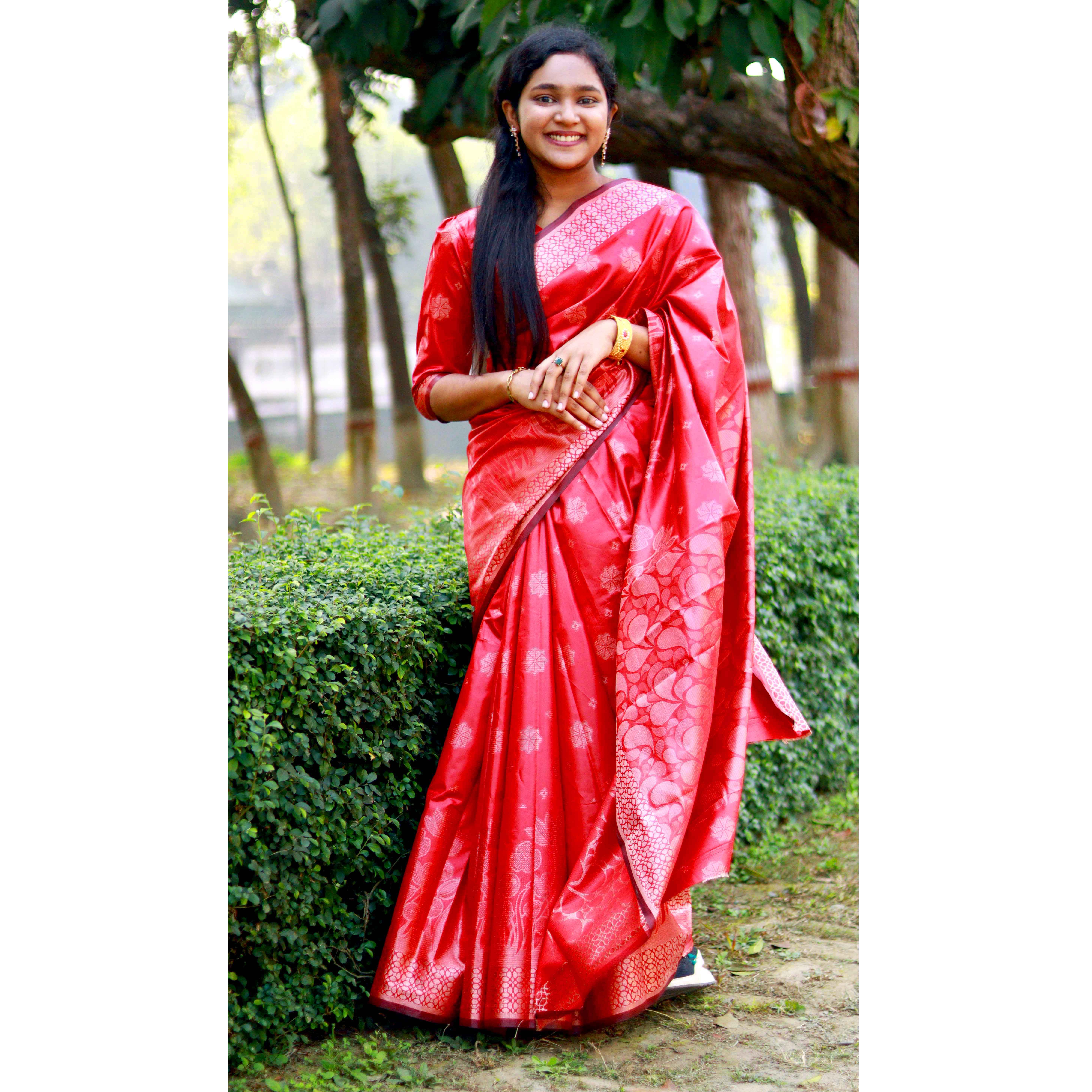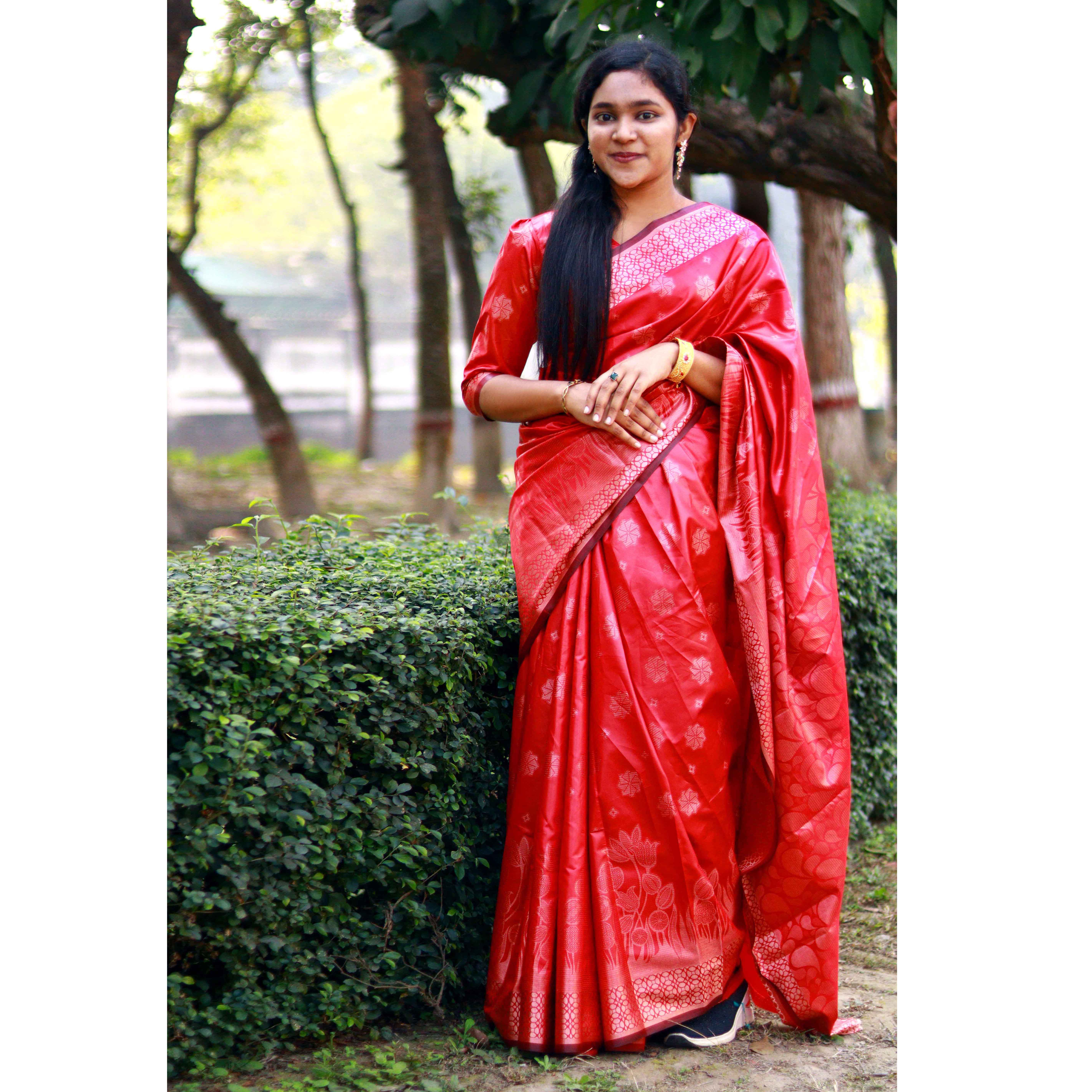 লাল কাতান সিল্ক শাড়ি – হাতে বোনা নকশা ব্লাউজ সহ