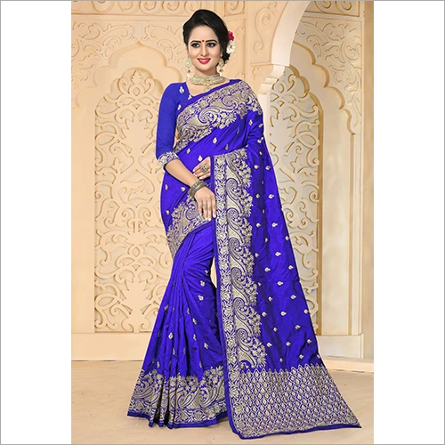 নীলচে সবুজ কাতান সিল্ক শাড়ি - ব্লাউ...