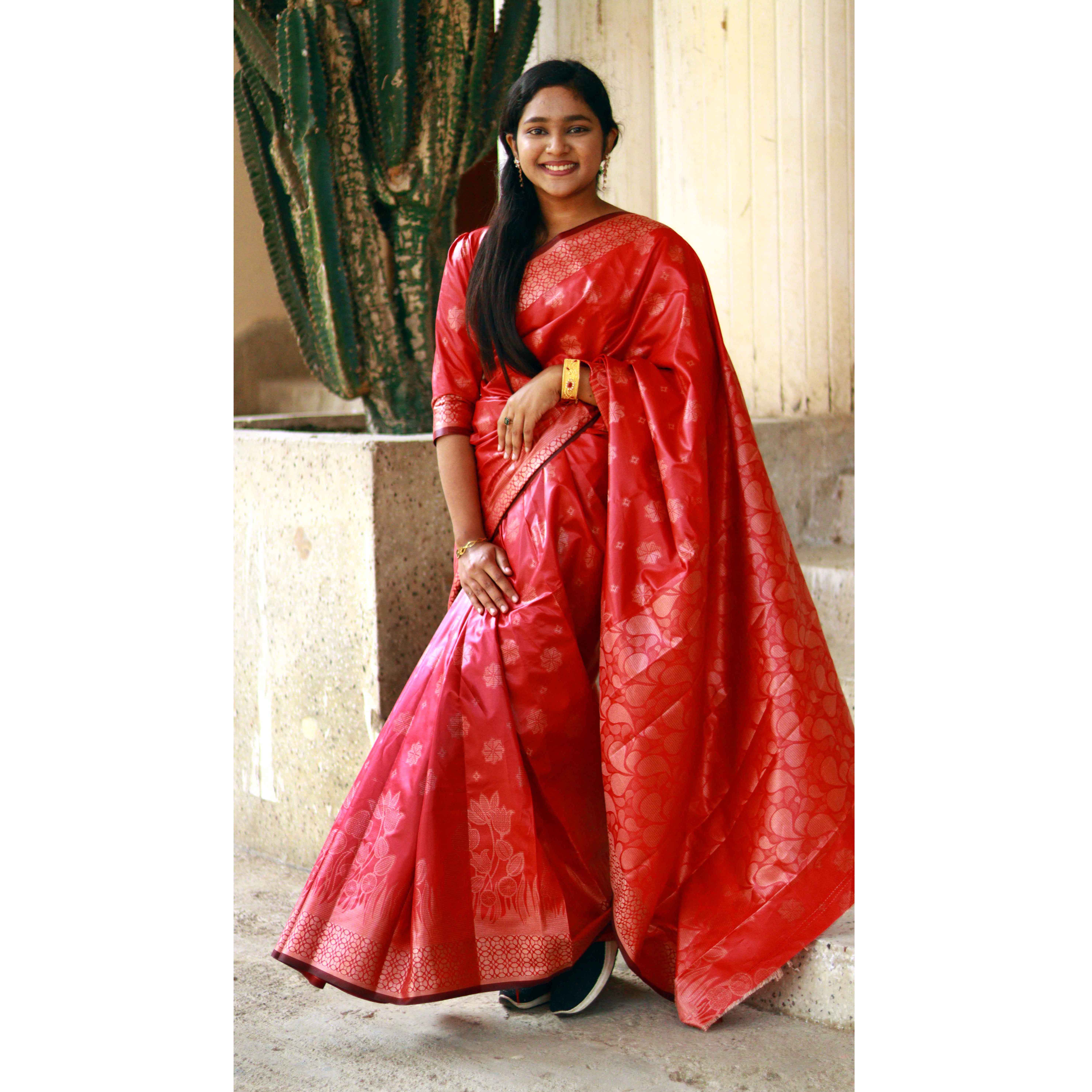 লাল কাতান সিল্ক শাড়ি – হাতে বোনা নকশা ব্লাউজ সহ